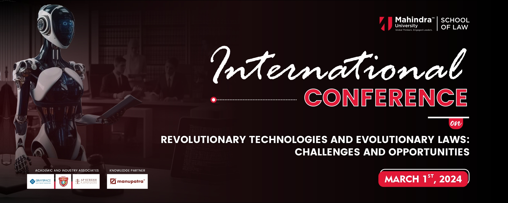 The School of Law, Mahindra University, (MU SOL), Hyderabad, India in collaboration with the Grayspace Law and Policy Consulting, Belgium, Centre for Human Security Studies, Hyderabad and A.P. Suresh and Associates, Law Chambers, Hyderabad are organizing a pioneering One-Day International Law and Technology Conference on “Revolutionary Technologies and Evolutionary Laws: Challenges and Opportunities” on March 1st, 2024. This conference boldly endeavours to seek out plausibility of potentials as well as apprehensions about law keeping pace with emerging technologies. The conference aims to foster a symbiotic relationship between law and technology, where one can navigate the complexities of the digital age and ensure a harmonious coexistence that benefits society as a whole. There is a lot at stake for us and this requires a dynamic and flexible approach to law, one that embraces innovation while upholding the principles of justice and fairness. The conference will bring together diverse perspectives from academia, practitioners and industry experts, who will share their experiences and expertise on the challenges and opportunities ahead. As technology continues to permeate every facet of our lives, the conference will focus on the role of law and legal professionals as gatekeepers, who must stay attuned to its implications and adapt their practices accordingly.