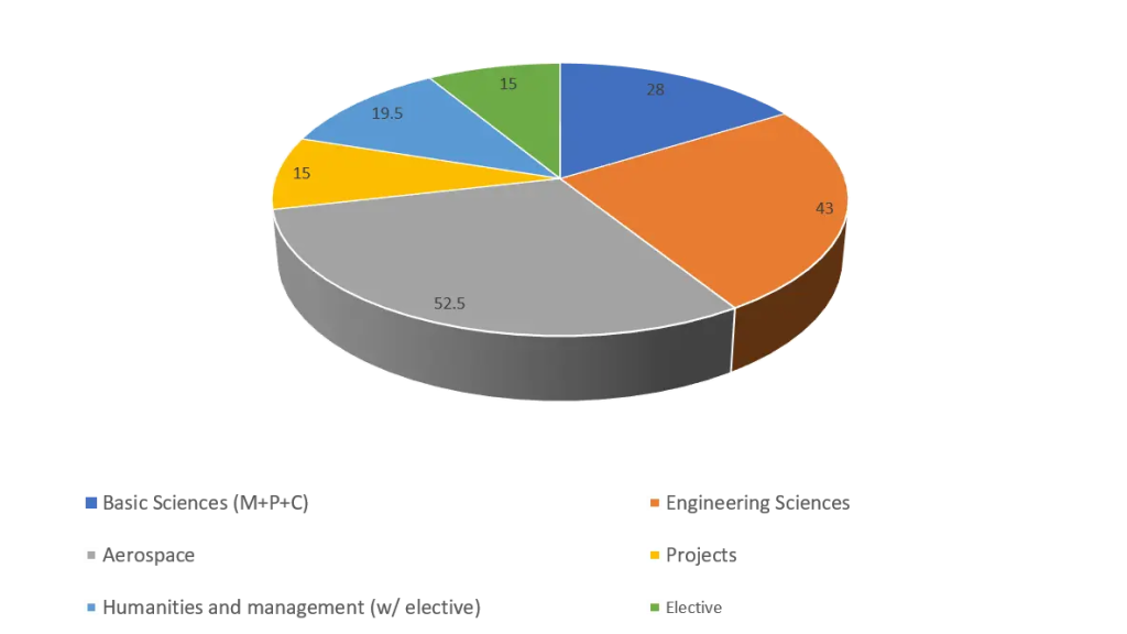 - Credit structure: Basic Sciences (28 credits), Engineering Sciences (43 credits), Aerospace (52.5 credits), Projects (15 credits), Humanities & Management (19.5 credits), Electives (15 credits), Total 173 credits.