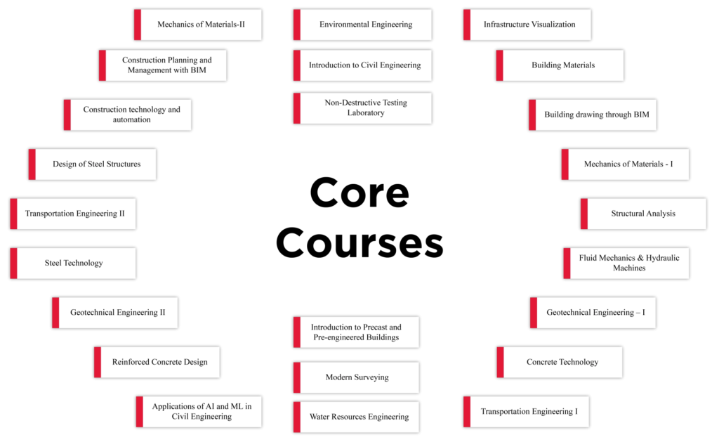 The curriculum emphasises current topics such as sustainable construction, environmental systems, transportation and water-resources, ensuring students are ready for real-world infrastructure challenges.